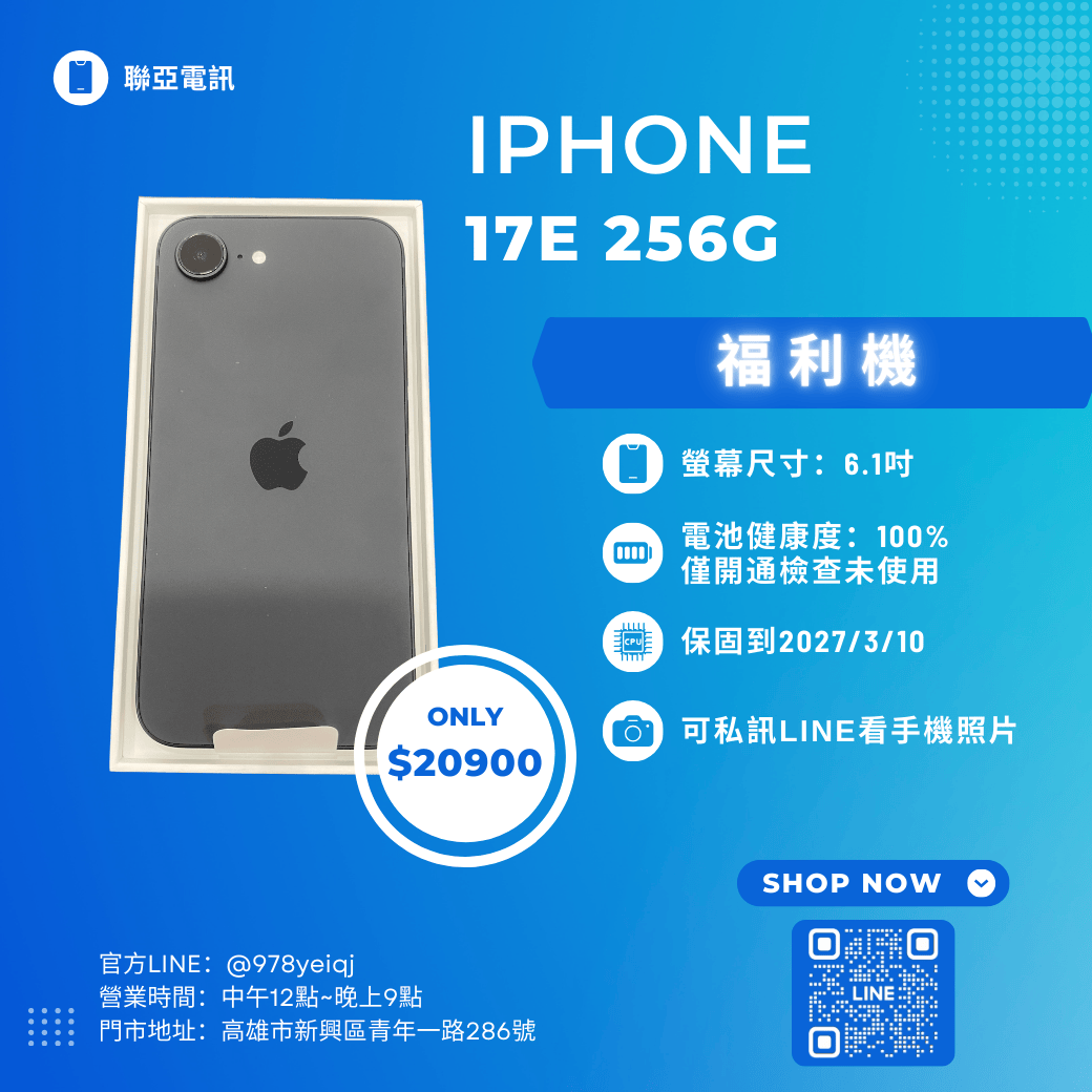 福利機IPhone 17E 256G 原廠保固到2027/03/10 已經過專業檢測 嚴選福利機 下訂單前請先私訊官方Line :@978yeiqj