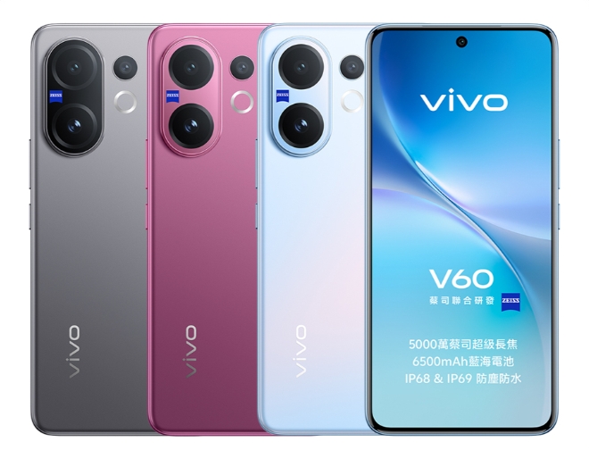 vivo V60 是 vivo 於 2025 年 8 月推出的中高階 5G 智慧型手機。該機型主打與蔡司(ZEISS)合作的影像系統、6500mAh 超大容量電池以及支援 IP68/IP69 頂級防塵防水等級。 處理器:搭載 Qualcomm Snapdragon 7 Gen 4 行動平台。 螢幕:6.77 吋 AMOLED 曲面螢幕,解析度為 2392 × 1080 (1.5K),支援 120Hz 更新率。 記憶體與儲存:提供 12GB RAM,搭配 256GB 或 512GB ROM。 電池與充電:內建 6500mAh 大電池,支援 90W FlashCharge 快閃充電。 蔡司影像系統 vivo V60 重新回歸三鏡頭配置,並獲得蔡司光學認證: 後置主鏡頭:5000 萬畫素(f/1.88),支援 OIS 光學防手震。 長焦鏡頭:5000 萬畫素(f/2.65)蔡司超級長焦鏡頭。 超廣角鏡頭:800 萬畫素(f/2.2)。 前置鏡頭:5000 萬畫素 AF 廣角鏡頭,支援 4K 錄影