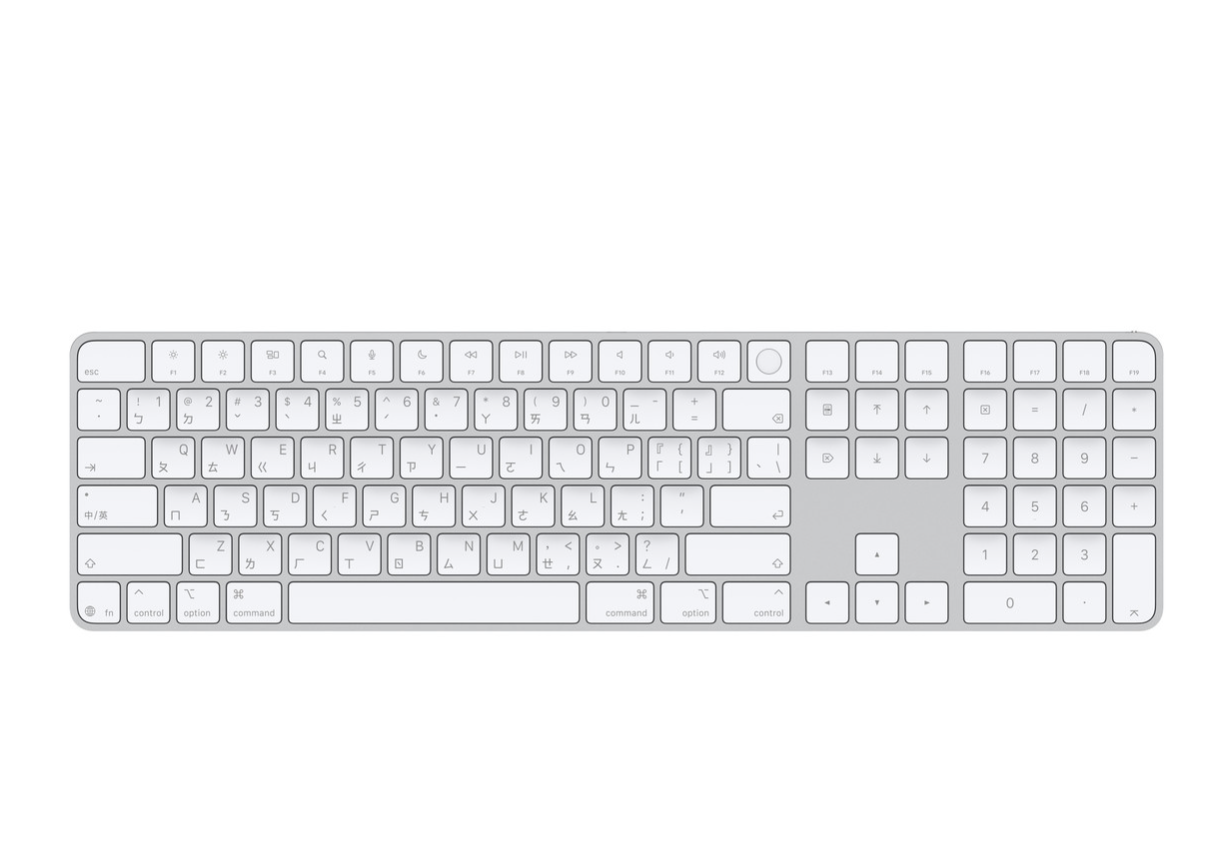 巧控鍵盤配備 Touch ID,提供快速、簡單且安全的認證方式,作為登入與購物之用。 巧控鍵盤擁有 Touch ID 和數字鍵盤,帶來格外舒適且精準的打字體驗。它延伸了鍵盤布局,具備用於快速捲動的文件導覽控制鍵及適合玩遊戲的全尺寸方向鍵;而數字鍵盤則非常適合用於試算表和財務相關應用程式上。採用無線設計,配備充電式電池,每次充電後能為鍵盤提供約一個月或更長時間的電力¹。還能與你的 Mac 自動配對,方便你立即開始工作。 具備 USB-C 埠,並隨附一條編織的 USB-C 充電連接線,可用來連接 Mac 上的 USB‑C 埠,方便進行配對與充電,只要用同一條連接線,就能為常用的裝置充電。