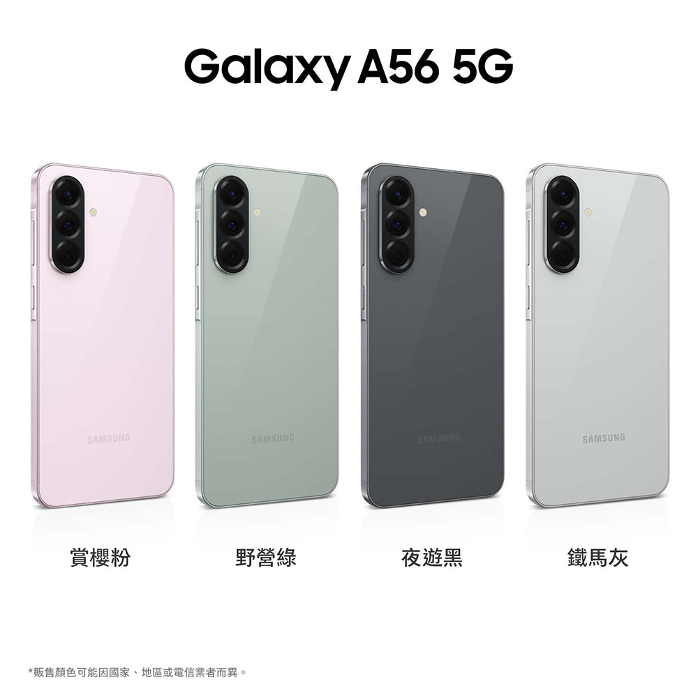 三星超人氣 AI 手機 SAMSUNG Galaxy A56 5G 6.7 吋 120Hz 螢幕 SAMSUNG Galaxy A56 5G 採用 6.7 吋 FHD+ 解析度 Super AMOLED 螢幕,搭配 O 極限全螢幕設計,支援最高 120Hz 螢幕更新率,畫面加倍流暢細膩;螢幕亮度提升至 1,200nits,即使在戶外畫面也清晰可見。生物辨識部分,支援光學螢幕指紋辨識,輕觸即可快速解鎖手機、完成身分驗證,有效保護個人隱私不外洩。 IP67 防塵防水 SAMSUNG Galaxy A56 5G 機身正反兩側都設有康寧大猩猩 Victus+ 玻璃,不僅能提高手機防摔抗刮的保護能力,同時也具備 IP67 防塵防水等級,日常使用更放心。外型採用俐落的直列鏡頭搭配質感玻璃背面,展現纖薄、時尚的外觀風格,提供「夜遊黑」、「鐵馬灰」、「賞櫻粉」和「野營綠」等顏色款式。 三星 Exynos 1580 SAMSUNG Galaxy A56 5G 運行 Android 15 作業系統、One UI 7 操作介面,規格搭載三星 Exynos 1580 八核心處理器,提供 8GB RAM + 256GB ROM、12GB RAM + 256GB ROM 雙版本。續航方面,内建 5,000mAh 電池,支援 45W 超快速充電 2.0,可在短時間內快速充飽手機。 專屬行動人工智慧 AI SAMSUNG Galaxy A56 5G 首次配備專屬行動人工智慧「Awesome Intelligence」,主打強大有趣且方便使用的工具為用戶開啟智慧生活;支援 AI 搜尋圈、物件橡皮擦、自拍濾鏡、智慧相片編輯等功能。此外,進一步支援「自動剪輯」與「最佳臉部表情」,除了可透過 AI 剪輯精彩片段,自動生成吸睛社群短影音外,多人合照也不怕有人閉眼,供用戶選出最上鏡 LOOK,張張成為社群焦點。 5,000 萬畫素三鏡頭 SAMSUNG Galaxy A56 5G 後置 5,000 萬畫素主鏡頭 + 1,200 萬畫素超廣角鏡頭 + 500 萬畫素微距鏡頭,主鏡頭支援 OIS 光學防手震、Video HDR,拍攝出遊美景、合照細節清晰不失真。前置 1,200 萬畫素自拍鏡頭,配備先進的 AP 與感測器,新增支援低噪點技術,即使在低光源環境也能捕捉清楚的畫面。