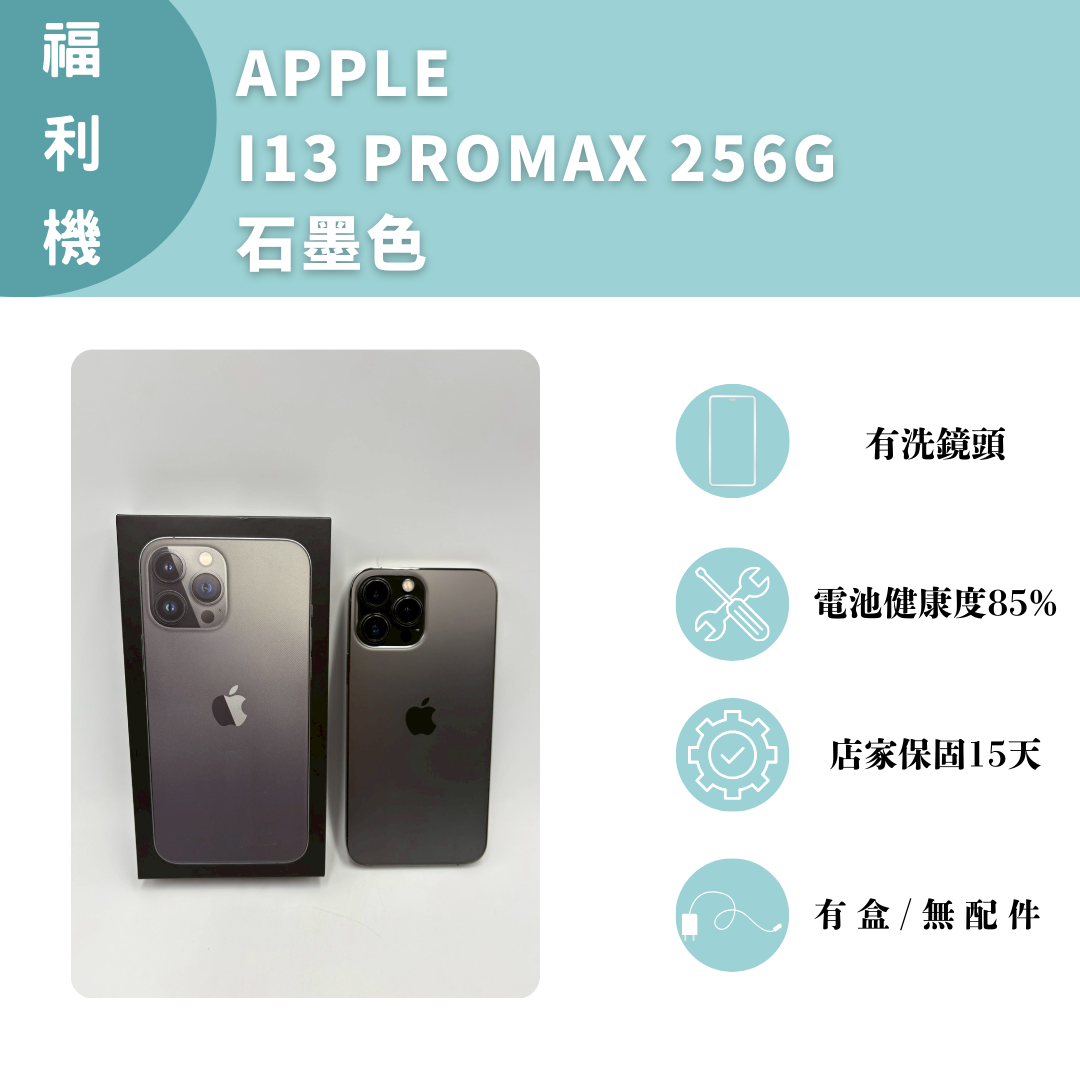 【手機名稱】 APPLE I13 PROMAX 【容量】256G 【顏色】石墨色 【外觀】近全新 【配件】有盒/無配件 【電池】電池健康度85% 【保固】店家保固15天 【維修】有洗鏡頭 下單前請先私訊和加LINE來幫您安排快速審核及回報審核進度 LINE ID:@kjg6280d 大呼小叫辰通訊行 雲林縣虎尾鎮林森路二段200號 電話:05-6339809 在地經營12年店家 GOOGLE 評價5顆星