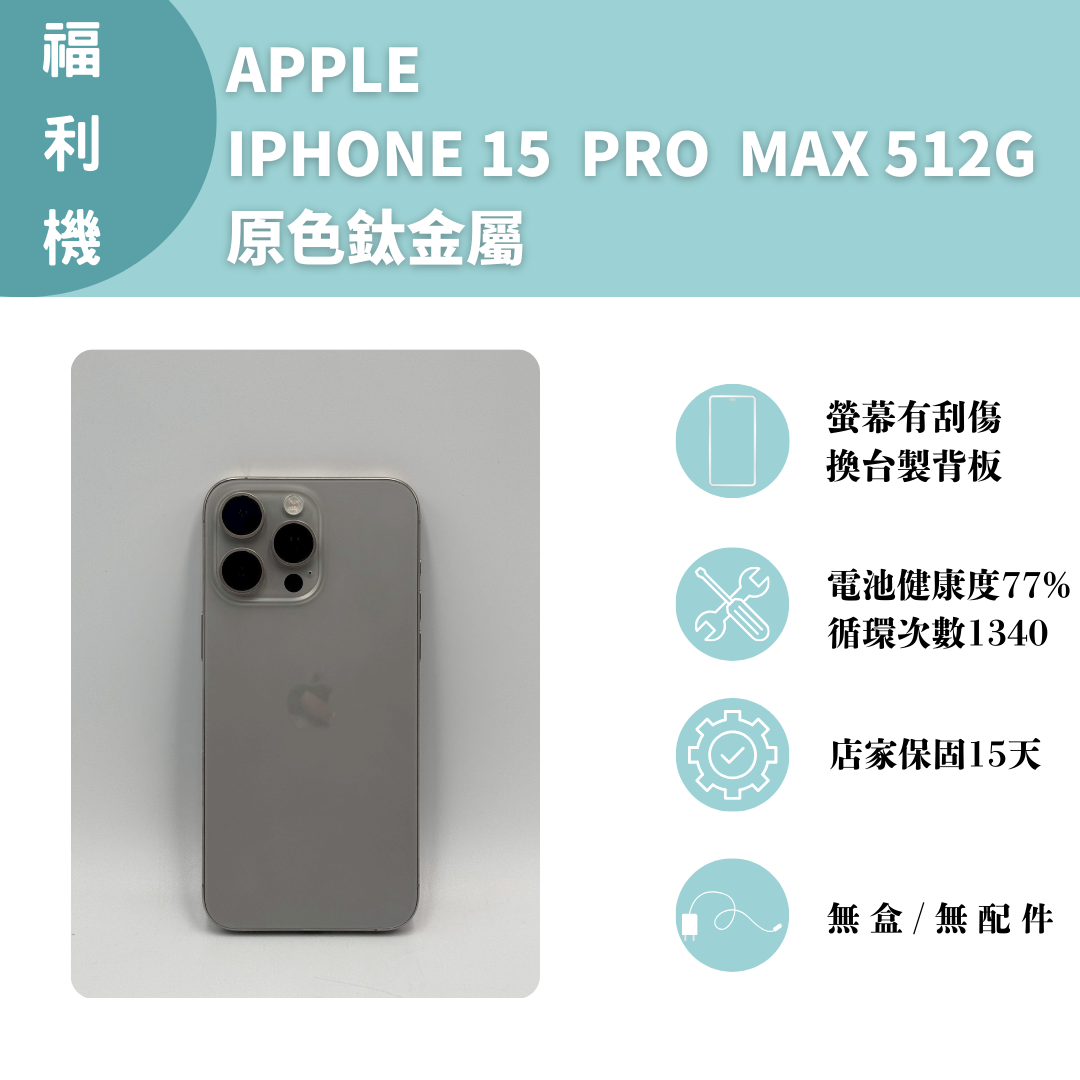 【手機名稱】APPLE I15 PRO MAX 【容量】 512G 【顏色】原色鈦金屬 【外觀】螢幕有刮傷 【配件】無盒/無配件 【電池】電池健康度77% 【保固】店家保固15天 【維修】換台製背板 下單前請先私訊和加LINE來幫您安排快速審核及回報審核進度 LINE ID:@kjg6280d 大呼小叫辰通訊行 雲林縣虎尾鎮林森路二段200號 電話:05-6339809 在地經營12年店家 GOOGLE 評價5顆星