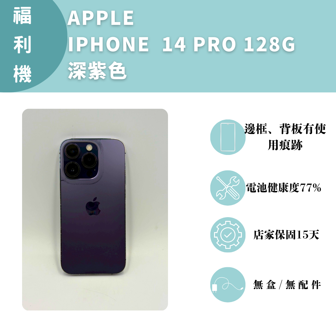 【手機名稱】 APPLE I14 PRO 【容量】128G 【顏色】深紫色 【外觀】邊框、背板有使用痕跡 【配件】無盒/無配件 【電池】電池健康度77% 【保固】店家保固15天 【維修】無 下單前請先私訊和加LINE來幫您安排快速審核及回報審核進度 LINE ID:@kjg6280d 大呼小叫辰通訊行 雲林縣虎尾鎮林森路二段200號 電話:05-6339809 在地經營12年店家 GOOGLE 評價5顆星