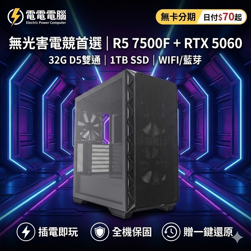 🔥 專為「低調實力派」玩家打造! 不喜歡花裡胡哨的光害?這台就是你的最佳選擇! 採用散熱與質感兼具的 MONTECH 903 BASE 機殼,搭配高 CP 值神 U AMD R5 7500F 與最新 RTX 5060 顯卡,讓你專注遊戲,效能不妥協。