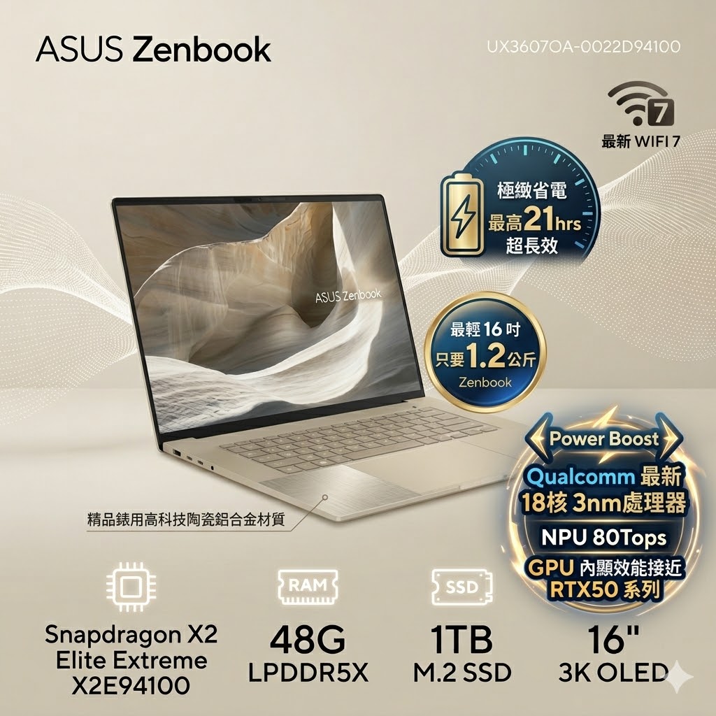 Qualcomm 最新18核3nm處理器 / NPU 80Tops / GPU內顯效能接近RTX50系列,流暢遊戲體驗 極緻省電最高21hrs超長效 / 最新WIFI 7 / 機殼採用精品錶用高科技陶瓷鋁合金材質 最輕的 16 吋 Zenbook 只要1.2 公斤 / 3K 120Hz ASUS Lumina OLED