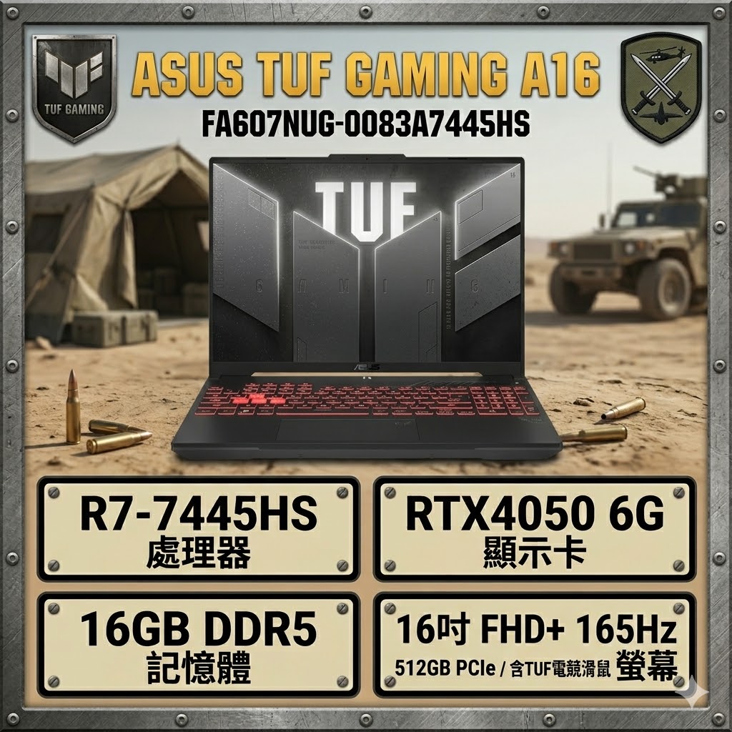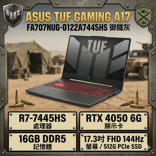 AMD 7000系列R7+RTX-4050系列TUF 軍規電競 MIL-STD-810G 軍規測試 支援G-SyncN防撕裂技術 單區RGB多彩鍵盤 HDMI & Type C With Diplay Port 支援雙螢幕輸出 全新刀鋒式3D風扇 / 0分貝風散寂靜模式 支援2個M.2 Pcie SSD 擴充Slot 支援WIFI 6 / 支援AI 降噪技術 30分鐘充電50%快充技術