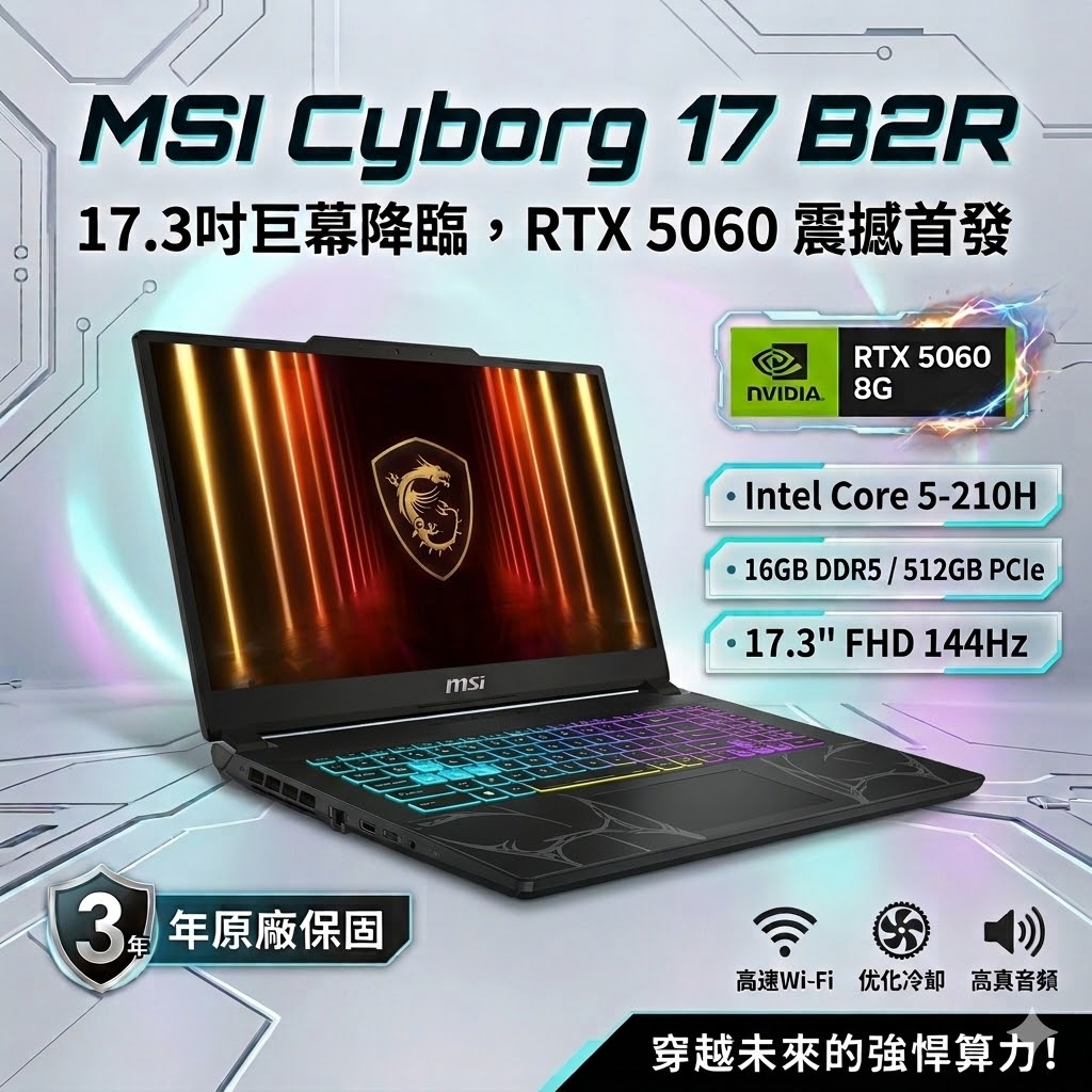 搭載 Intel® Core™ i7 處理器 14700HX 搭載最新 GeForce RTX™ 5060 筆記型電腦 GPU 8GB GDDR7 17.3吋QHD (2560x1440), 240Hz更新率, 100% sRGB, IPS等級電競面板 獨立顯卡模式 (MUX設計) 將GPU效能推升至全新境界 獨家Cooler Boost 5 高效散熱技術 獨家微星AI智慧引擎提供AI運算體驗 MSI App Player 軟體,用電競筆電暢玩手遊 支援播放高解析音樂 Wi-Fi 6E提供極速無線網路體驗 原廠三年保固 Windows 11 Home