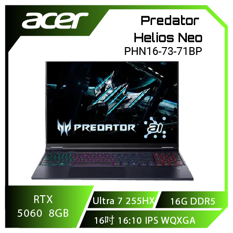 搭載 Intel® Core™ Ultra 7 處理器 255HX 搭載最新 NVIDIA® GeForce RTX™ 5060 筆記型電腦 8GB GDDR7 16吋QHD+ (2560x1600), 16:10, 240Hz更新率, 100% DCI-P3, IPS等級電競面板