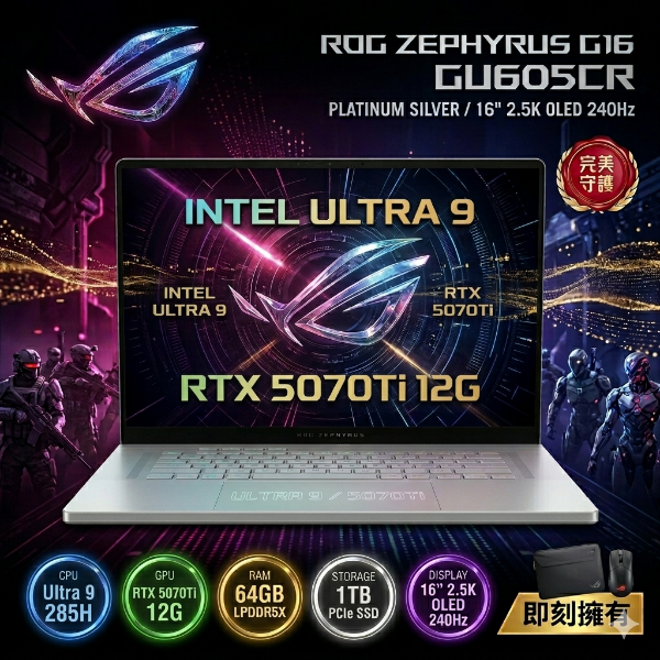 全機金屬 全球最輕薄效能電競 1.49cm & 1.95kg Slash上蓋動態燈效 Nebula霓真技術 2.5K OLED+240Hz / 0.2ms 100% DCI-P3 / Delta-E < 1 的色彩準確度+ Pantone 色彩認證 100萬:1 高對比度 / Dolby Vision 技術 提高畫面生動 / G-Sync Intel Core Ultra 9 / 強悍效能 RTX 5070 Ti / 獨顯直連 ROG智慧散熱:均溫板提高散熱效率、液態金屬降低13度,改善14倍導熱性、Arc Flow 84葉片 16:10 超大觸控板與放大12%鍵帽 提供最佳操作體驗 4揚聲器+雙重低音喇叭 / Dolby Atmos / AI 語音降噪 30分鐘快充50%電力 / PD充電