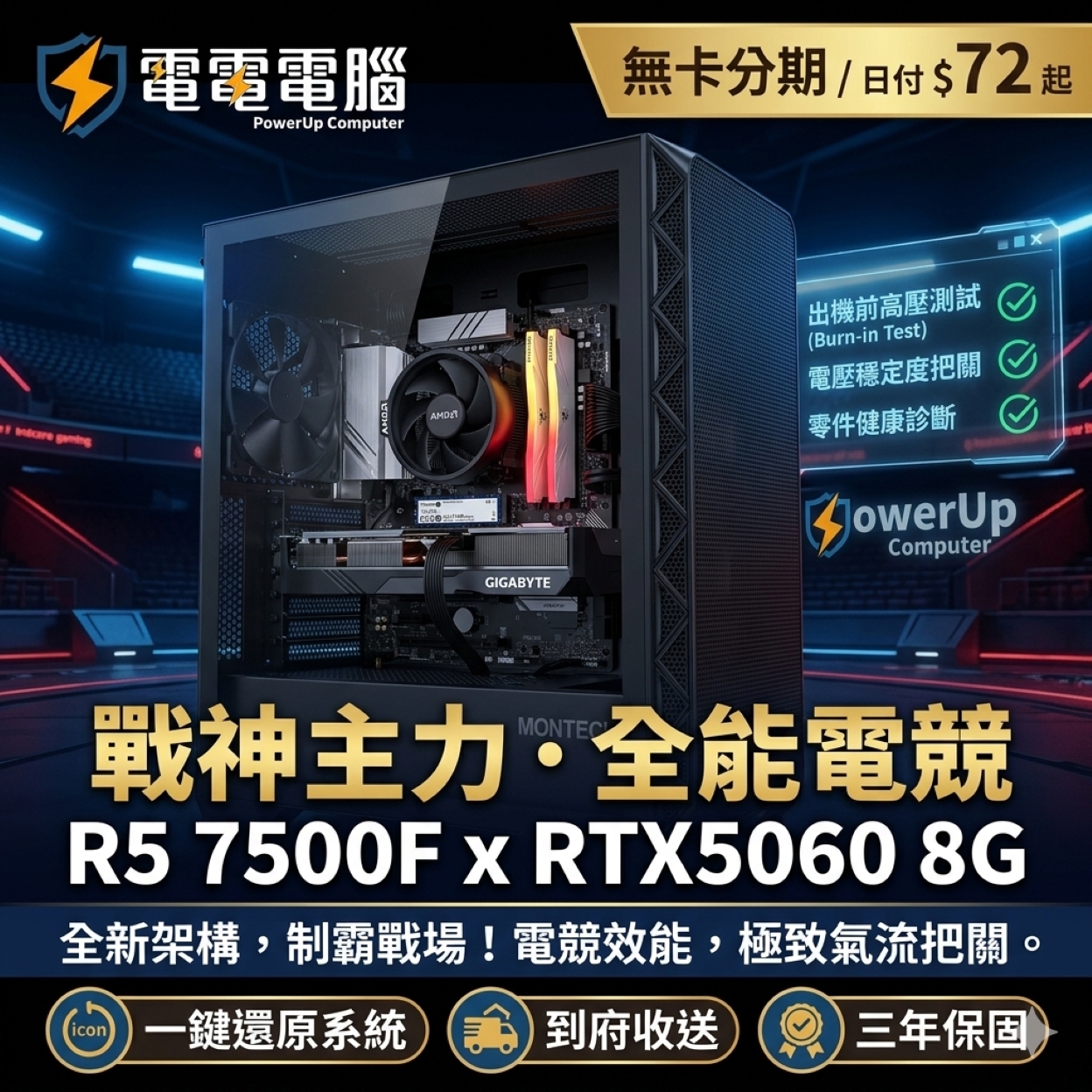 「每一台電電電腦,都是經過嚴格把關的成果。我們深知您對性能與穩定的追求,因此承諾每一台主機都通過 24 小時高壓燒機測試,電壓穩定度百分百把關,並進行嚴格的零件健康診斷,讓客戶知道我們是經過完整測試才出貨的。此外,每一台電腦皆標示『送一鍵還原系統』,即使電腦有問題,也只需一個按鍵,即刻救援,讓您使用無憂,絕不變電腦孤兒。」