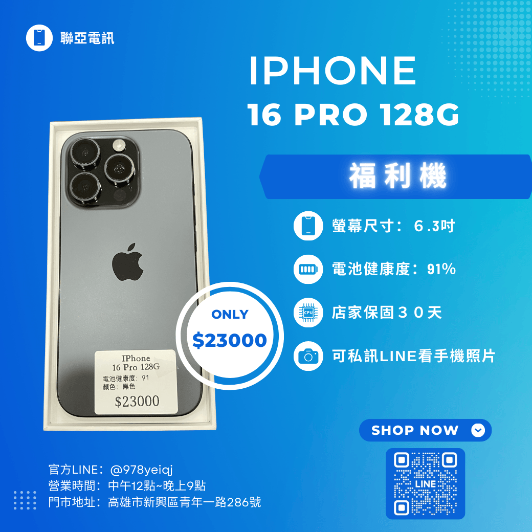 福利機IPhone 16 PRO 128G 已經過專業檢測 嚴選福利機 下訂單前請先私訊官方Line :@978yeiqj 購買即贈 保護貼+保護殼+充電線