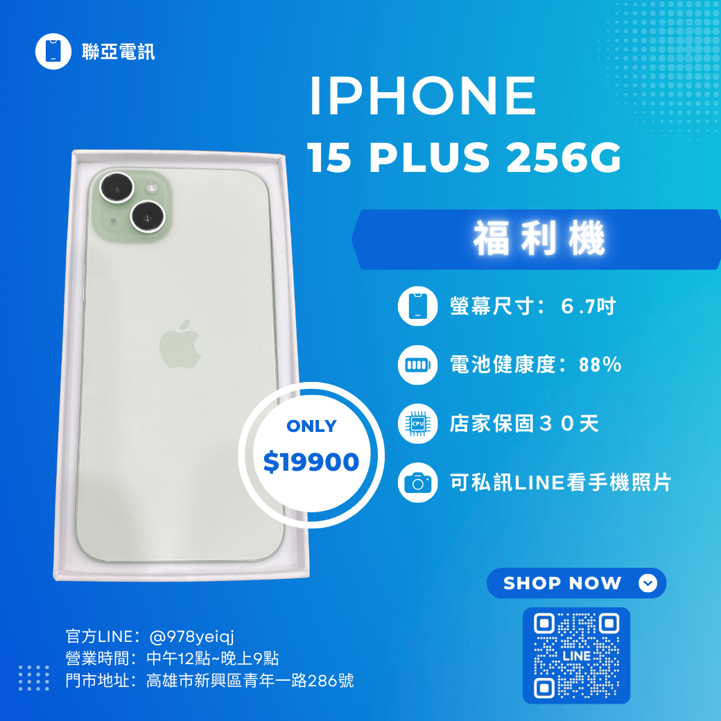 福利機IPhone 15 PLUS 256G 已經過專業檢測 嚴選福利機 下訂單前請先私訊官方Line :@978yeiqj 購買即贈 保護貼+保護殼+充電線