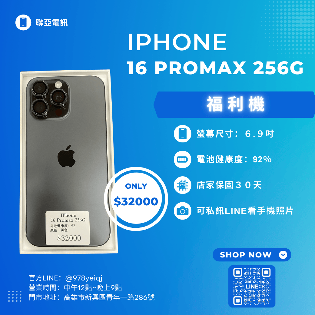 福利機IPhone 16 PROMAX 256G 已經過專業檢測 嚴選福利機 下訂單前請先私訊官方Line :@978yeiqj 購買即贈 保護貼+保護殼+充電線