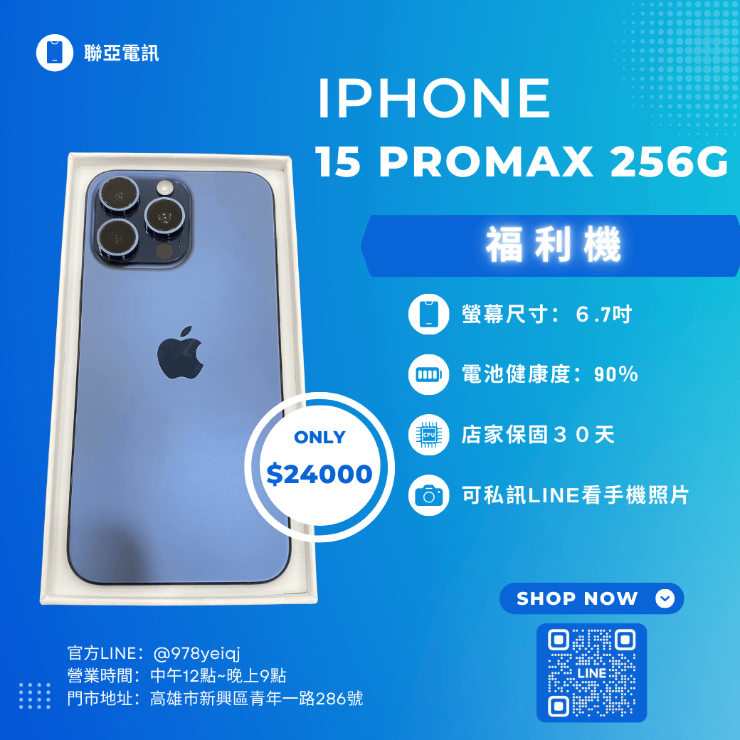 福利機IPhone 15 PROMAX 256G 已經過專業檢測 嚴選福利機 下訂單前請先私訊官方Line :@978yeiqj 購買即贈 保護貼+保護殼+充電線