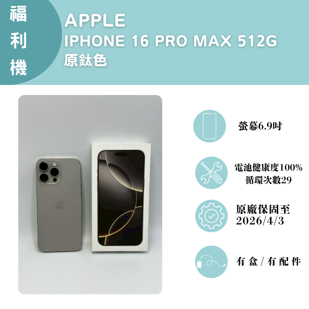【手機名稱】 APPLE I16 PRO MAX 【容量】512G 【顏色】原鈦色 【配件】有盒子/有配件 【電池】電池健康度100% 循環次數29 下單前請先私訊和加LINE來幫您安排快速審核及回報審核進度 LINE ID:@kjg6280d 大呼小叫辰通訊行 雲林縣虎尾鎮林森路二段200號 電話:05-6339809 在地經營12年店家 GOOGLE 評價5顆星