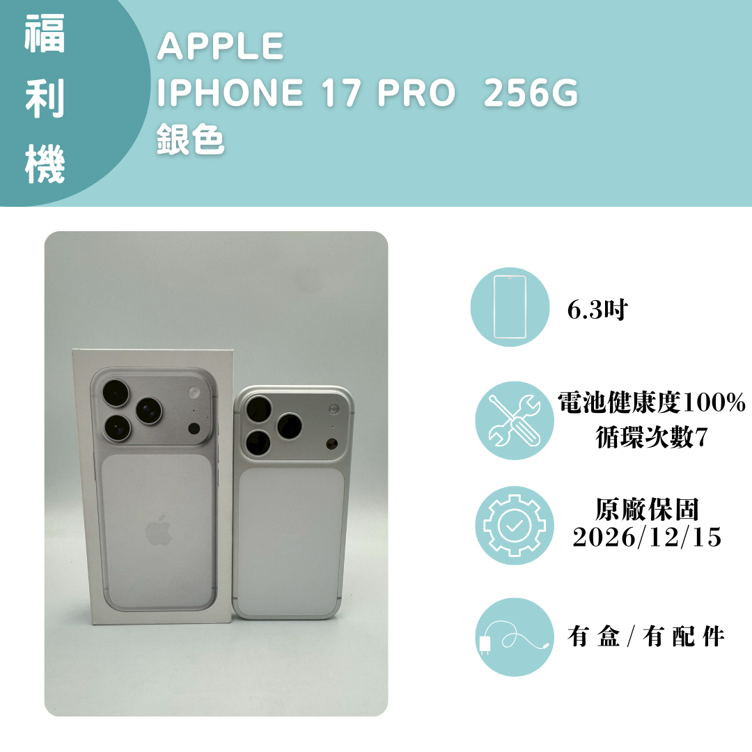 【手機名稱】 APPLE I17 PRO 【容量】256G 【顏色】銀色 【配件】有盒子/有配件 【電池】電池健康度100% 循環次數7 【保固】原廠保固2026/12/15 下單前請先私訊和加LINE來幫您安排快速審核及回報審核進度 LINE ID:@kjg6280d 大呼小叫辰通訊行 雲林縣虎尾鎮林森路二段200號 電話:05-6339809 在地經營12年店家 GOOGLE 評價5顆星