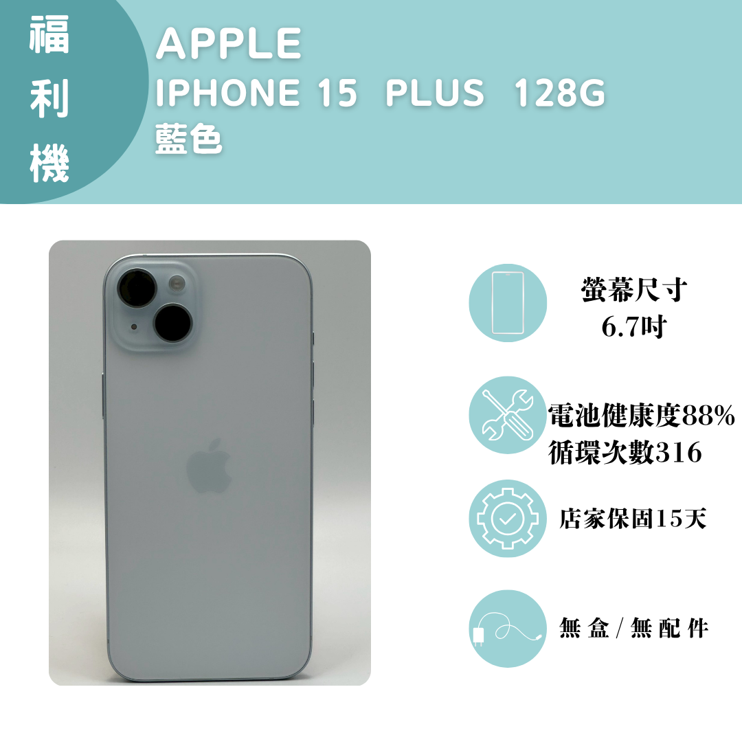 【手機名稱】 APPLE I15 PLUS 【容量】128G 【顏色】藍色 【配件】無盒子/無配件 【電池】電池健康度88% 循環次數316 下單前請先私訊和加LINE來幫您安排快速審核及回報審核進度 LINE ID:@kjg6280d 大呼小叫辰通訊行 雲林縣虎尾鎮林森路二段200號 電話:05-6339809 在地經營12年店家 GOOGLE 評價5顆星