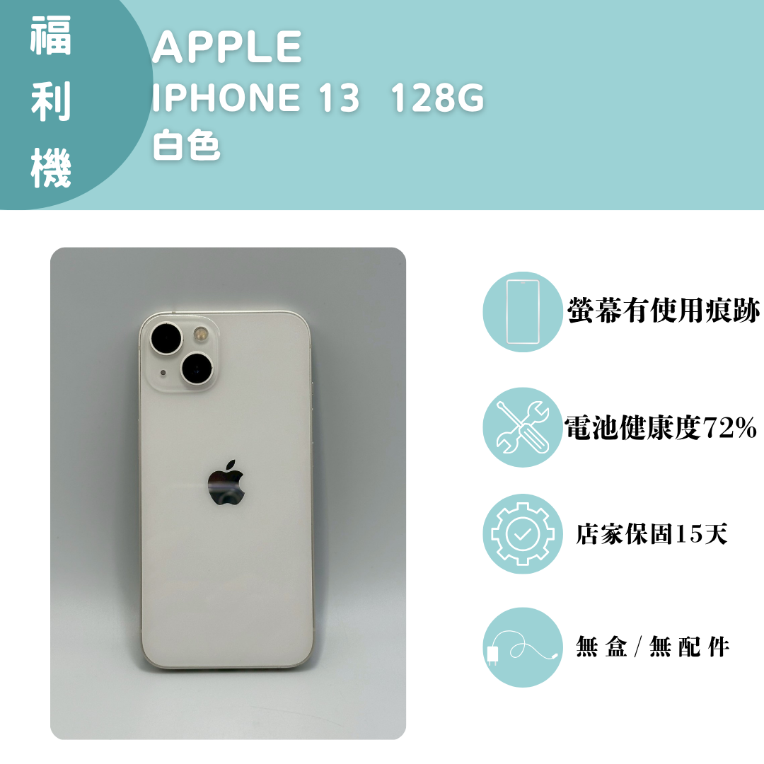 【手機名稱】 APPLE I13 【容量】128G 【顏色】白色 【配件】無盒子/無配件 【電池】電池健康度72% 下單前請先私訊和加LINE來幫您安排快速審核及回報審核進度 LINE ID:@kjg6280d 大呼小叫辰通訊行 雲林縣虎尾鎮林森路二段200號 電話:05-6339809 在地經營12年店家 GOOGLE 評價5顆星