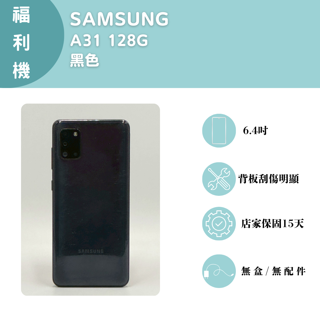 【手機名稱】三星 A31 【容量】4/128G 【顏色】黑色 【外觀】背板刮傷明顯 【維修】無 【配件】無盒子/無配件 下單前請先私訊和加LINE來幫您安排快速審核及回報審核進度 LINE ID:@kjg6280d 大呼小叫辰通訊行 雲林縣虎尾鎮林森路二段200號 電話:05-6339809 在地經營12年店家 GOOGLE 評價5顆星