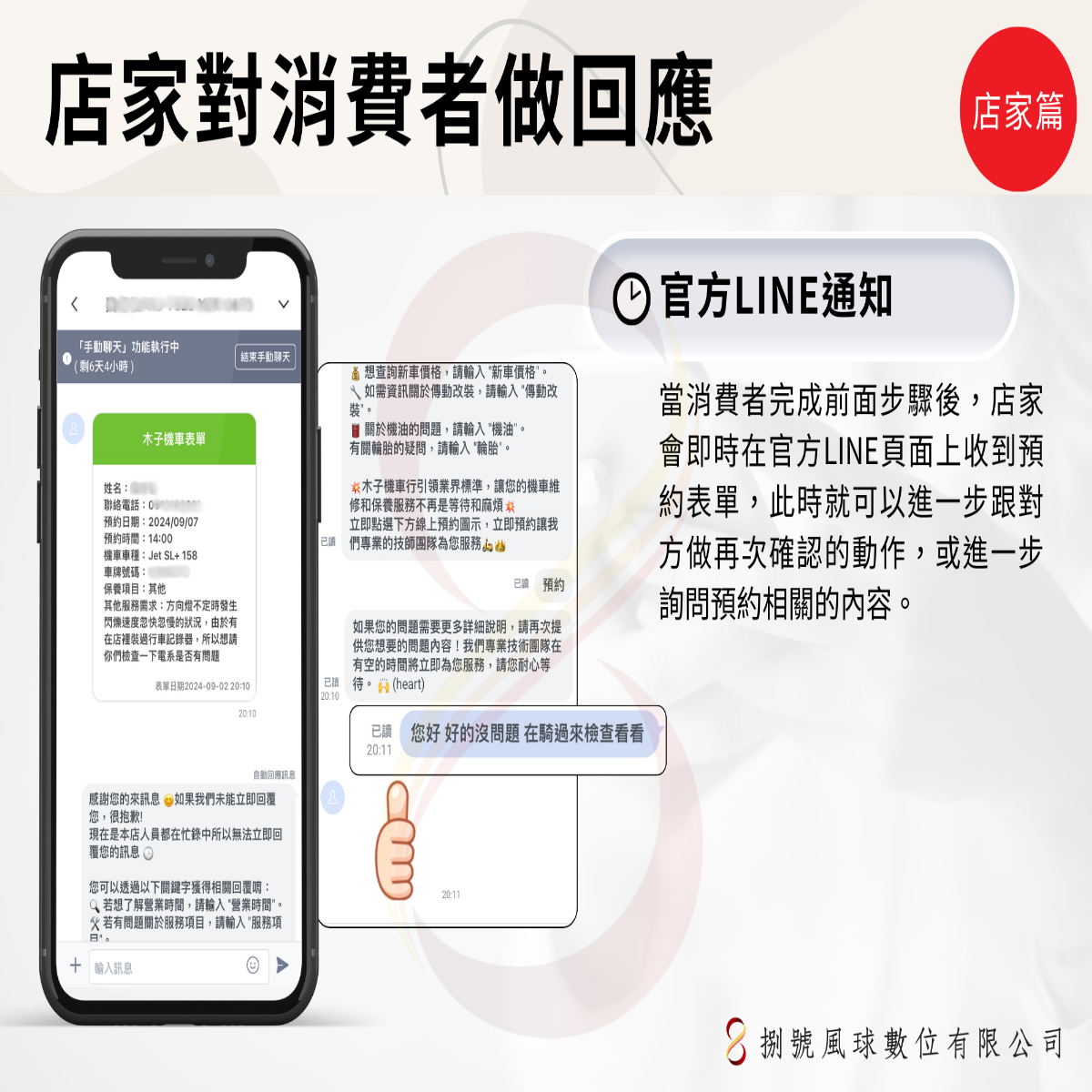 🚀 讓技術說話,管理無憂! 捌號風球數位有限公司提供的官方LINE@系統,為您的機車行帶來前所未有的管理便利。 🔧 專業技師團隊隨時準備解決各種車輛問題,一切預約流程透明化,讓管理變得輕而易舉。👨🔧 🔹 針對多技師管理需求設計 🔹 釋放您的經營壓力 🔹 強化團隊內部溝通 🔹 實時更新客戶預約狀態 🔹 有效快速的客戶互動 📲 轉型您的機車行,加入捌號風球數位有限公司的行列,體驗數位管理的極致便捷。立即聯繫我們!