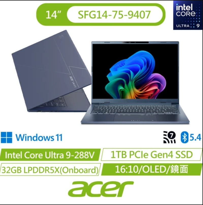 全新外觀設計,漸層色鍵盤 纖薄美型,鋁合金機身,厚度最薄僅9.6mm 可180度攤平 影音視訊兩用觸控板,使用更方便 Intel Core Ultra(Series 2)處理器 99 Total TOPs 內建AcerSense智能應用工具,一鍵掌控筆電狀況