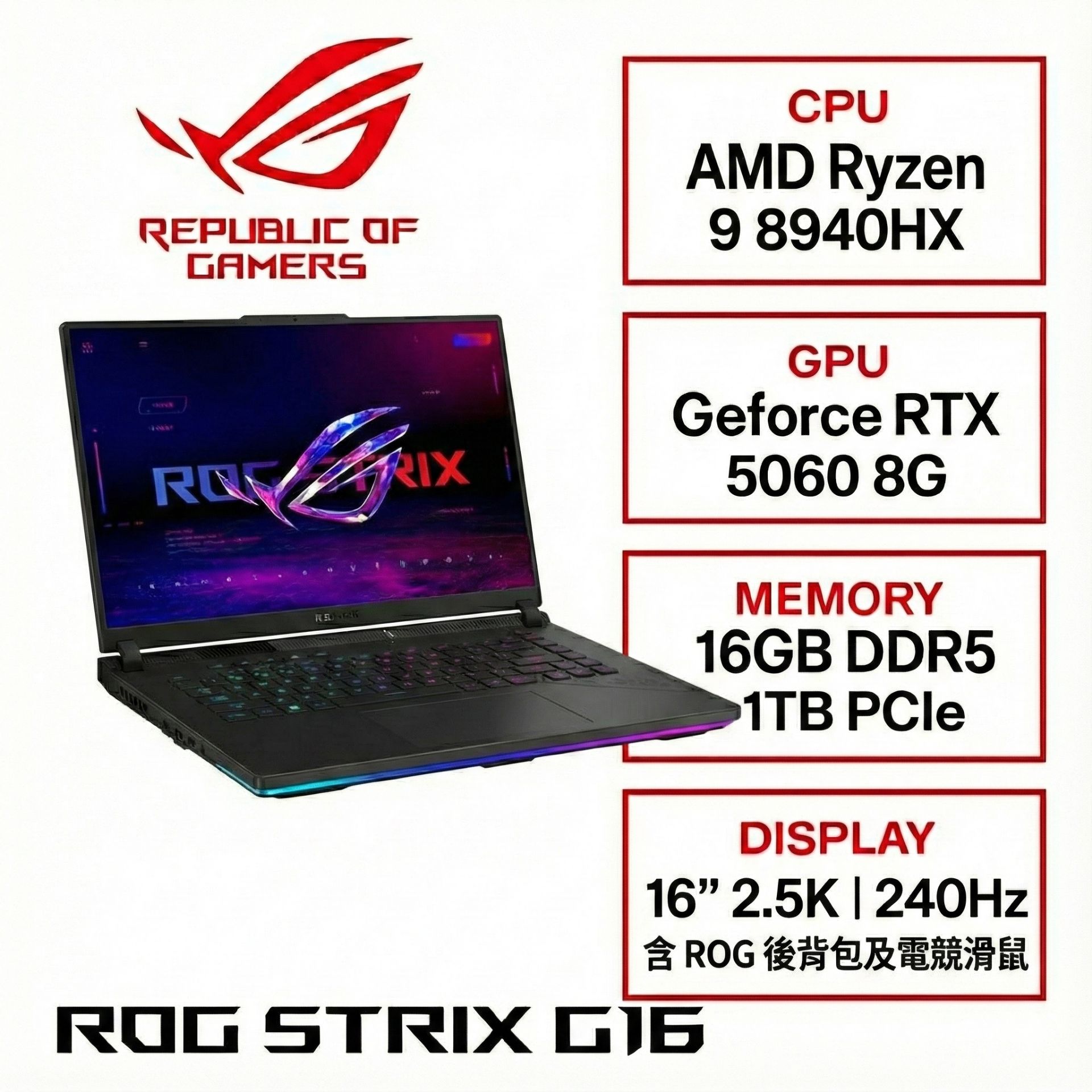 16吋 2.5K+240Hz 面板 Ryzen 9 8940HX + 強悍效能 RTX 5060 隨貨附ROG 電競後背包+ROG Impact 電競滑鼠