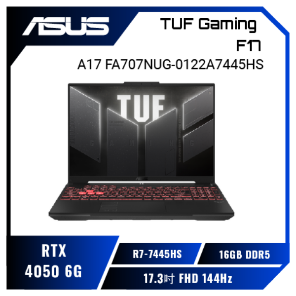 AMD 7000系列R7+RTX-2050系列TUF 軍規電競 MIL-STD-810H 軍規測試 支援G-SyncN防撕裂技術 單區RGB多彩鍵盤 HDMI & Type C With Diplay Port 支援雙螢幕輸出 全新刀鋒式3D風扇 / 0分貝風散寂靜模式 支援2個M.2 Pcie SSD 擴充Slot 支援WIFI 6 / 支援AI 降噪技術 30分鐘充電50%快充技術