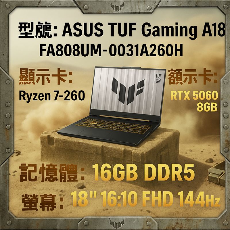 NVIDIA® GeForce RTX™ 5060 8GB GDDR7 (具備MUX獨顯直連) AMD Ryzen™ 7 260 Processor 3.8GHz 18-inch / FHD+ 16:10 (1920 x 1200, WUXGA) / 144Hz