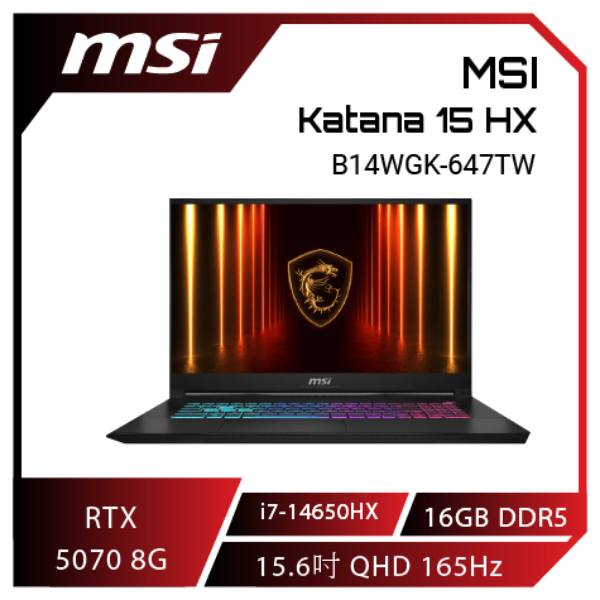 搭載 Intel i7-14650HX 處理器 搭載 NVIDIA® GeForce RTX™ 5070 筆記型電腦GPU 8GB GDDR7 15.6吋 QHD, 165Hz更新率, IPS等級面板,DCI-P3 100%