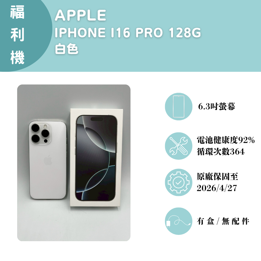 【手機名稱】APPLE I16 PRO 【容量】128G 【顏色】白色 【配件】有盒子/無配件 【電池】電池健康度92% 循環次數364 下單前請先私訊和加LINE來幫您安排快速審核及回報審核進度 LINE ID:@kjg6280d 大呼小叫辰通訊行 雲林縣虎尾鎮林森路二段200號 電話:05-6339809 在地經營12年店家 GOOGLE 評價5顆星