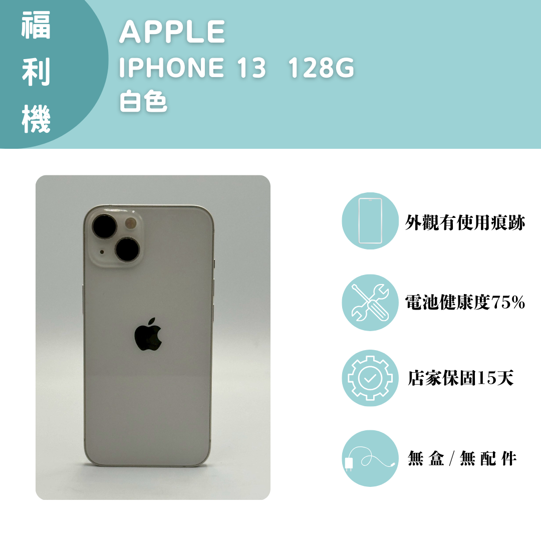 【手機名稱】APPLE I13 【容量】128G 【顏色】白色 【外觀】外觀有使用痕跡 【維修】無 【配件】無盒子/無配件 【電池】電池健康度75% 下單前請先私訊和加LINE來幫您安排快速審核及回報審核進度 LINE ID:@kjg6280d 大呼小叫辰通訊行 雲林縣虎尾鎮林森路二段200號 電話:05-6339809 在地經營12年店家 GOOGLE 評價5顆星