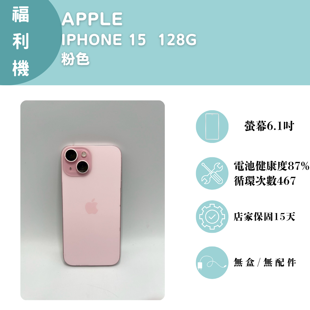 【手機名稱】 APPLE I15 【容量】128G 【顏色】粉色 【配件】無盒子/無配件 【電池】電池健康度87% 【外觀】螢幕6.1吋 下單前請先私訊和加LINE來幫您安排快速審核及回報審核進度 LINE ID:@kjg6280d 大呼小叫辰通訊行 雲林縣虎尾鎮林森路二段200號 電話:05-6339809 在地經營12年店家 GOOGLE 評價5顆星