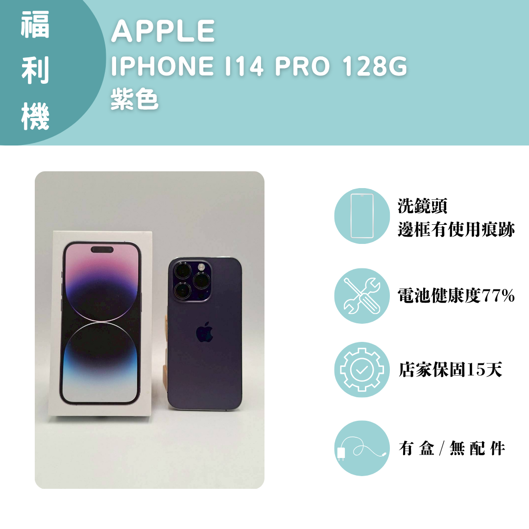 【手機名稱】APPLE I14 PRO 【容量】128G 【顏色】紫色 【外觀】邊框有使用痕跡 【維修】清鏡頭 【配件】有盒子/無配件 【電池】電池健康度77% 下單前請先私訊和加LINE來幫您安排快速審核及回報審核進度 LINE ID:@kjg6280d 大呼小叫辰通訊行 雲林縣虎尾鎮林森路二段200號 電話:05-6339809 在地經營12年店家 GOOGLE 評價5顆星