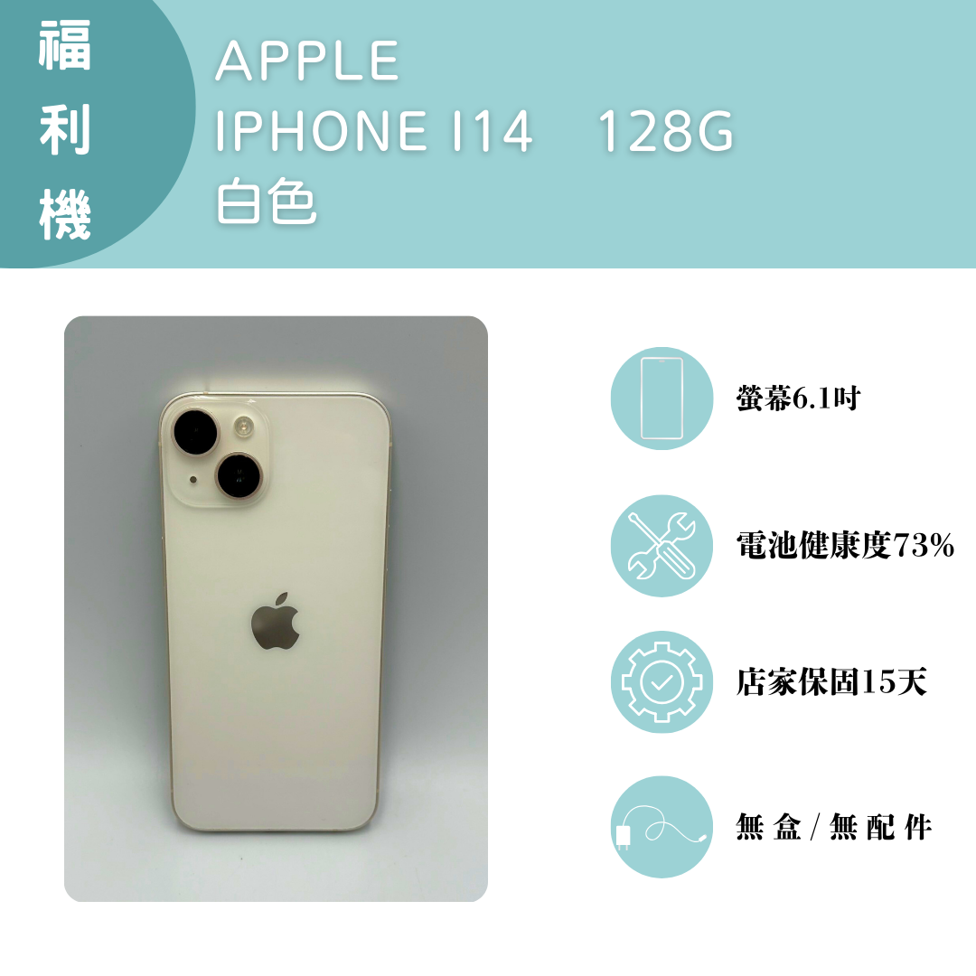 【手機名稱】 APPLE I14 【容量】128G 【顏色】白色 【外觀】近全新 【配件】無盒子/無配件 【電池】電池健康度73% 【保固】無原廠保固 下單前請先私訊和加LINE來幫您安排快速審核及回報審核進度 LINE ID:@kjg6280d 大呼小叫辰通訊行 雲林縣虎尾鎮林森路二段200號 電話:05-6339809 在地經營12年店家 GOOGLE 評價5顆星