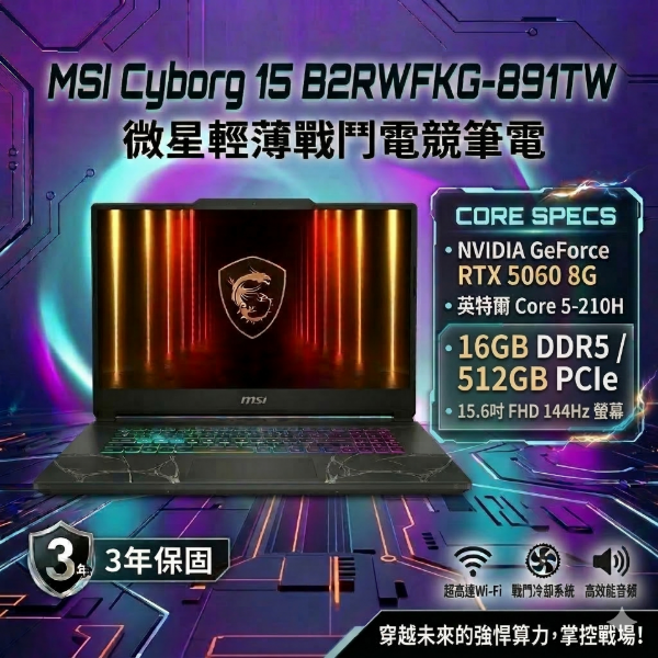 搭載 Intel® Core™ 5 處理器 210H 搭載最新 NVIDIA® GeForce RTX™ 5060 筆記型電腦 GPU 8GB GDDR7,支援NVIDIA Blackwell架構、DLSS 4及 Max-Q 技術 獨家微星AI智慧引擎針對使用情境自動切換最佳效能模式 15.6吋Full HD (1920x1080), 144Hz更新率, IPS電競等級面板 穿透感半透明機身設計 4區RGB全彩背光電競鍵盤搭配WASD醒目熱鍵 支援播放高解析音樂 Windows 11 Home 3年原廠保固