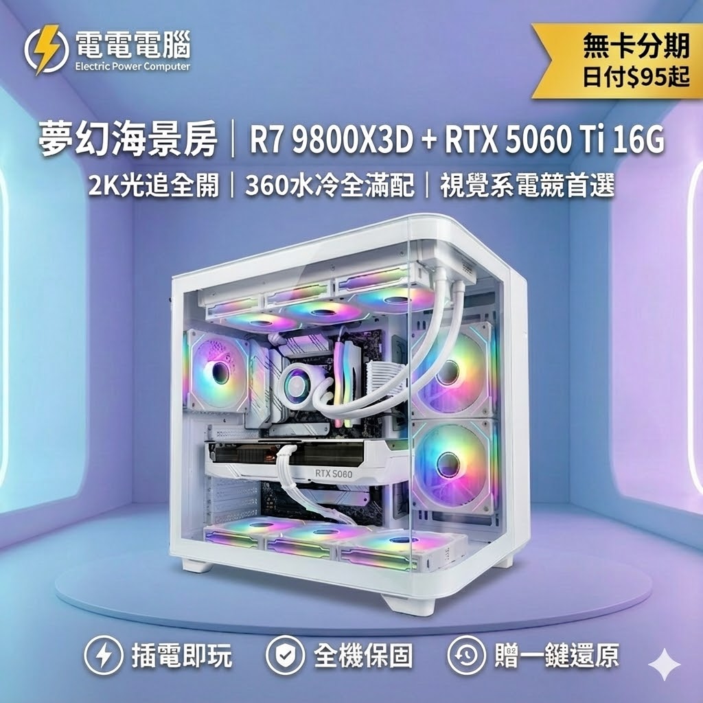 還在看黑漆漆的電腦主機? 這台**「全白雙曲面海景房」,搭配訂製彩虹霓虹線**,開機的瞬間,你的桌面就是全場焦點!不僅好看,搭載目前地表最強遊戲處理器 R7 9800X3D,顏值與實力不再需要妥協。