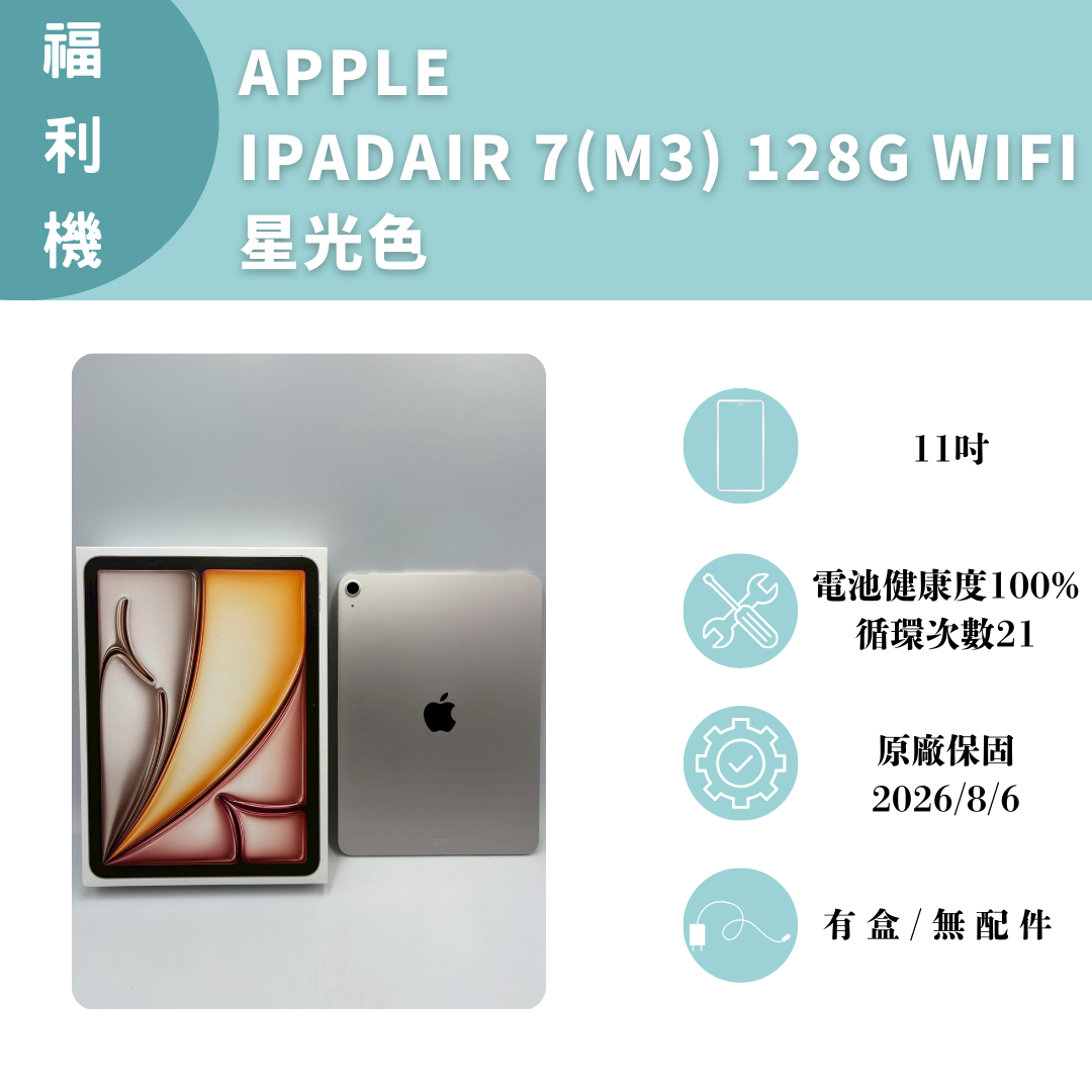 【手機名稱】 IPAD AIR 7(M3) WIFI 【容量】128G 【顏色】星光色 【外觀】近全新 【配件】有盒/無配件 【電池】電池健康度100%循環次數21 【保固】原廠保固2026/8/6 【維修】無 下單前請先私訊和加LINE來幫您安排快速審核及回報審核進度 LINE ID:@kjg6280d 大呼小叫辰通訊行 雲林縣虎尾鎮林森路二段200號 電話:05-6339809 在地經營12年店家 GOOGLE 評價5顆星