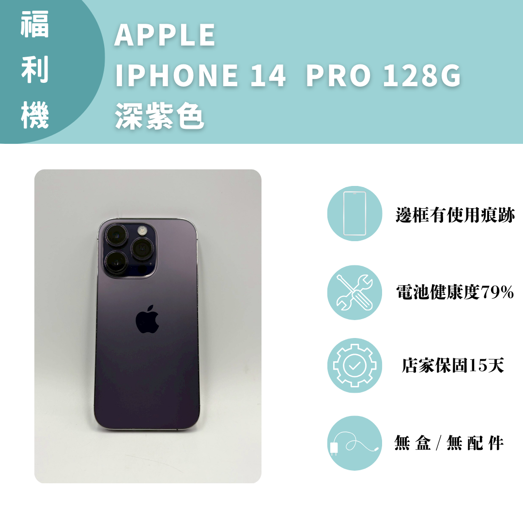 【手機名稱】 APPLE I14 PRO 【容量】128G 【顏色】深紫色 【外觀】邊框有使用痕跡 【配件】無盒/無配件 【電池】電池健康度79% 【保固】店家保固15天 【維修】無 下單前請先私訊和加LINE來幫您安排快速審核及回報審核進度 LINE ID:@kjg6280d 大呼小叫辰通訊行 雲林縣虎尾鎮林森路二段200號 電話:05-6339809 在地經營12年店家 GOOGLE 評價5顆星