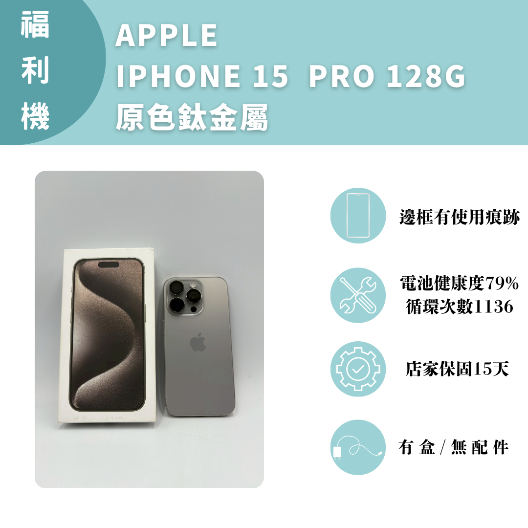 【手機名稱】 APPLE I15 PRO 【容量】128G 【顏色】原色鈦金屬 【外觀】邊框有使用痕跡 【配件】有盒/無配件 【電池】電池健康度79%循環次數1136 【保固】店家保固15天 【維修】無 下單前請先私訊和加LINE來幫您安排快速審核及回報審核進度 LINE ID:@kjg6280d 大呼小叫辰通訊行 雲林縣虎尾鎮林森路二段200號 電話:05-6339809 在地經營12年店家 GOOGLE 評價5顆星