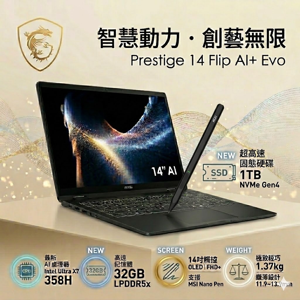 搭載 Intel® Core™ Ultra X7 處理器 358H 14吋FHD+ (1920 x 1200), OLED, 16:10, 觸控面板, 100% DCI-P3色域範圍 支援MSI Nano Pen觸控筆