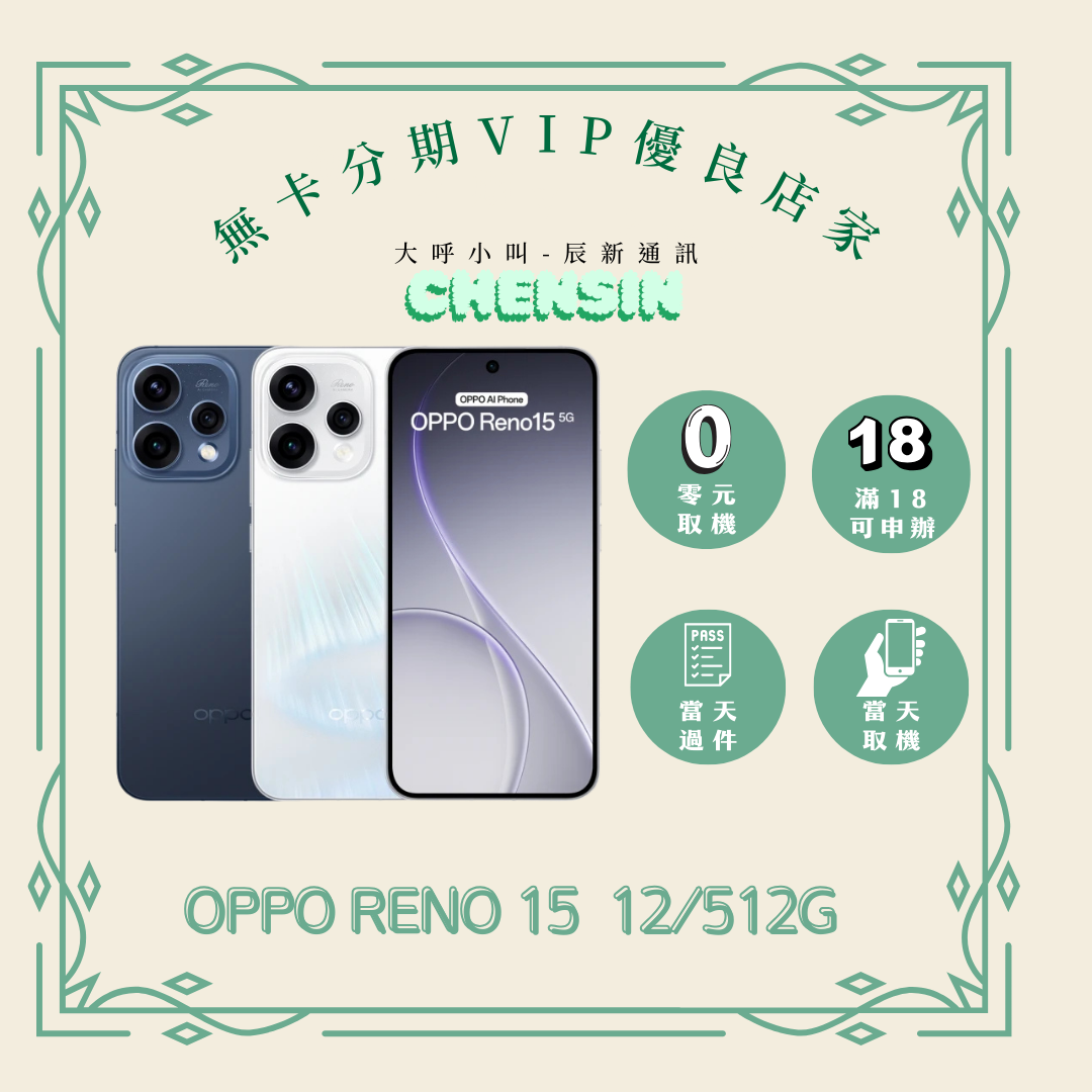 遠信額度可直接使用無需審核 【商品名稱】OPPO RENO 15 【容量】 12/512G 下單前請先私訊和加LINE來幫您安排快速審核及回報審核進度 LINE ID:@kjg6280d 大呼小叫辰通訊行 雲林縣虎尾鎮林森路二段200號 電話:05-6339809 在地經營12年店家 GOOGLE 評價5顆星