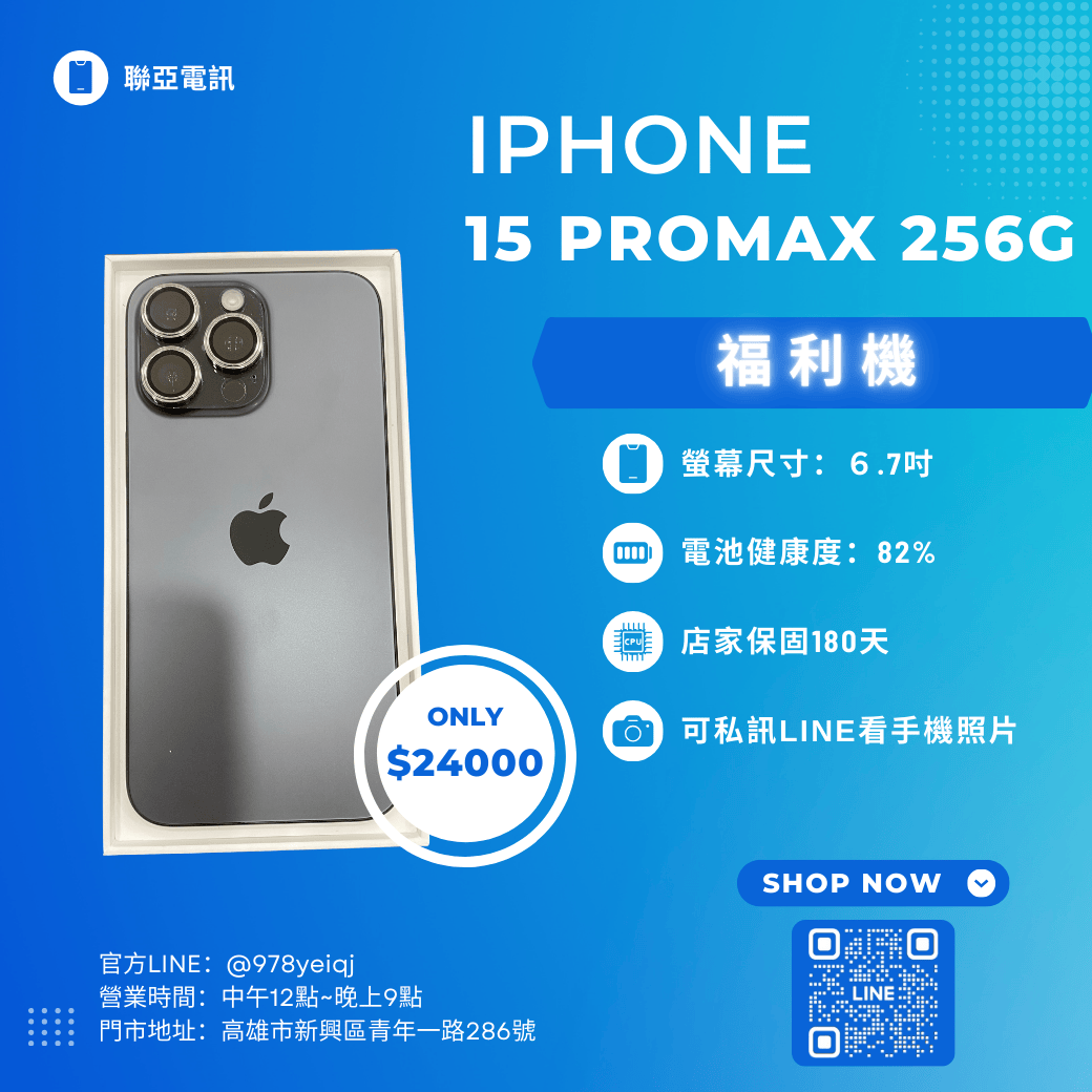 福利機IPhone 15 PROMAX 256G 保固180天 已經過專業檢測 嚴選福利機 下訂單前請先私訊官方Line :@978yeiqj 購買即贈 保護貼+保護殼+充電線