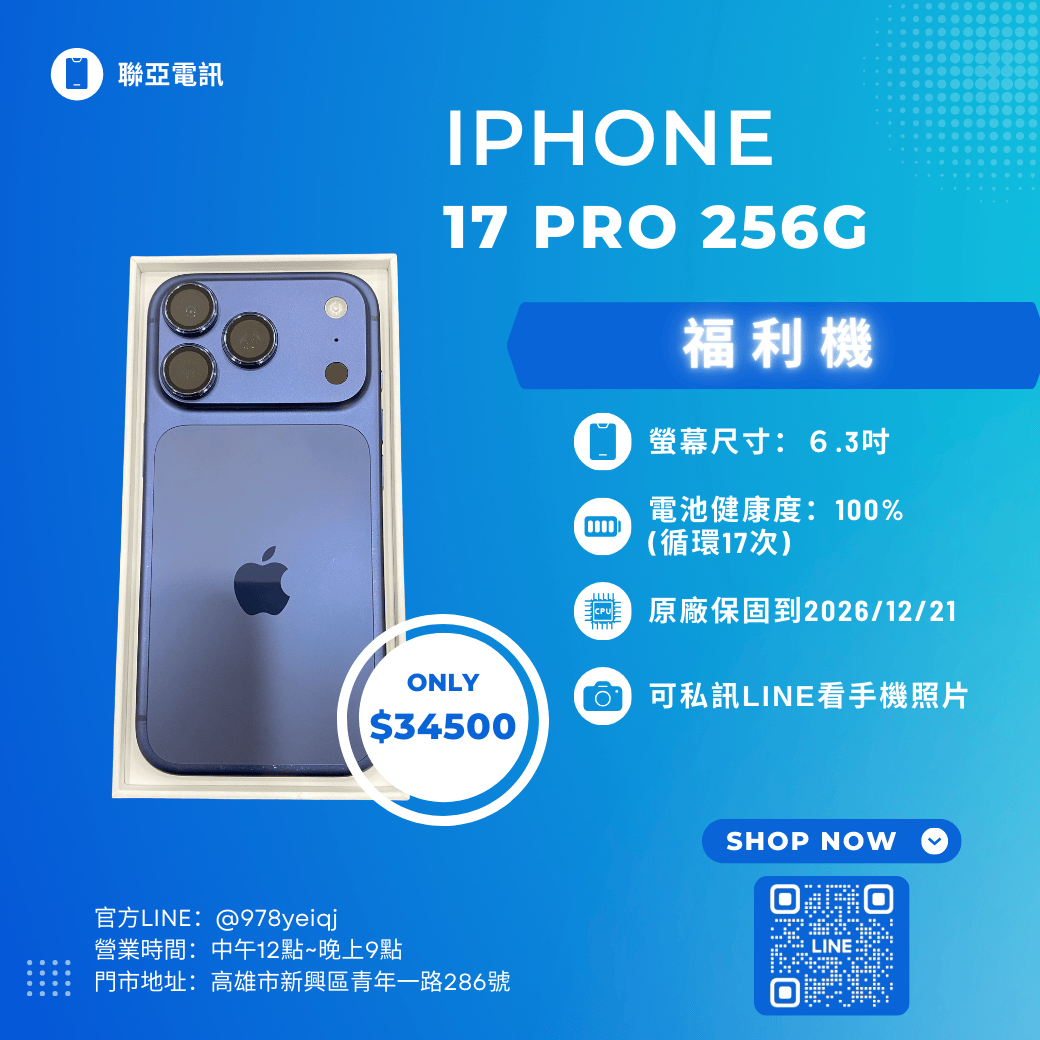 福利機IPhone 17 PRO 256G 已經過專業檢測 嚴選福利機 下訂單前請先私訊官方Line :@978yeiqj 購買即贈 保護貼+保護殼+充電線