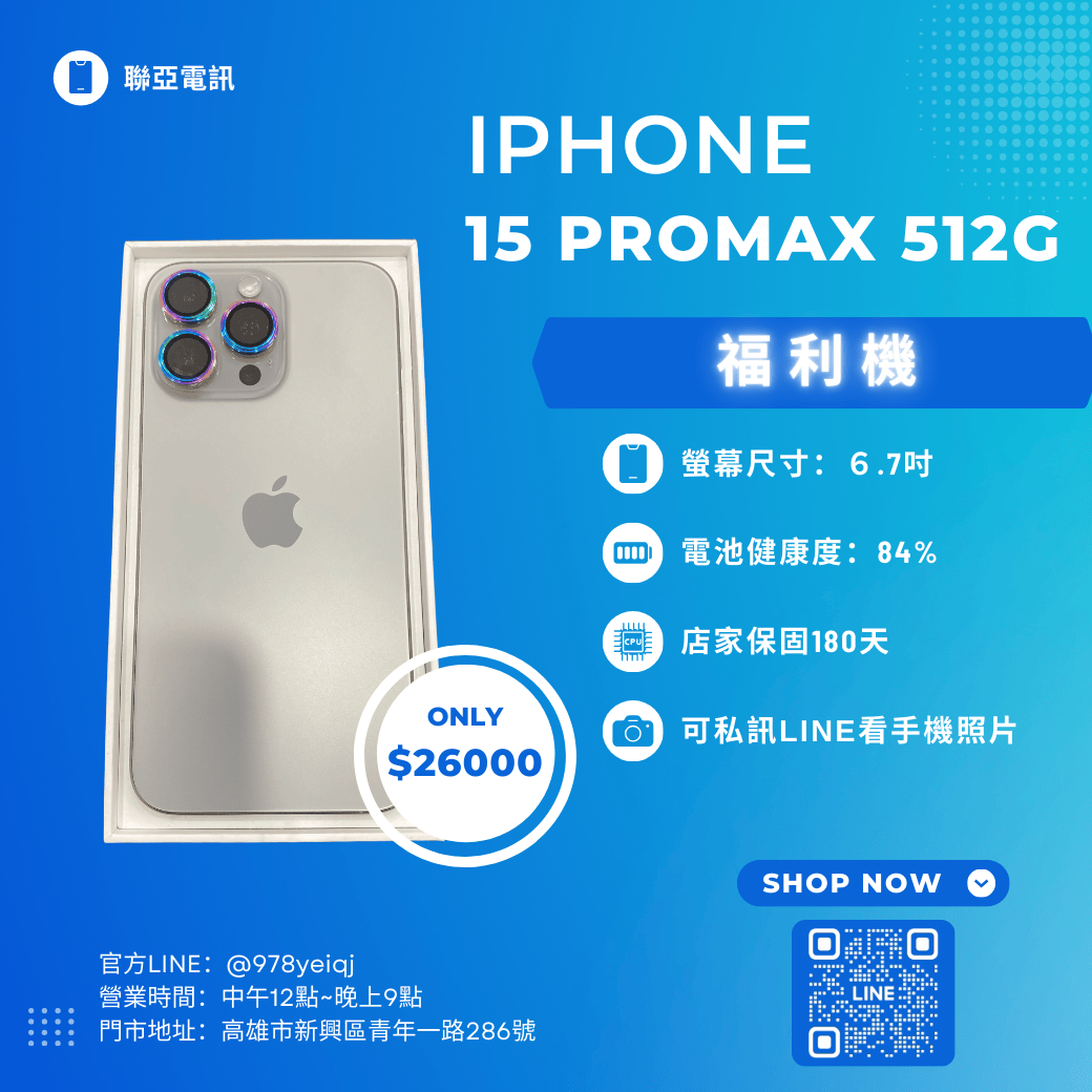 福利機IPhone 15 PROMAX 512G 保固180天 已經過專業檢測 嚴選福利機 下訂單前請先私訊官方Line :@978yeiqj 購買即贈 保護貼+保護殼+充電線