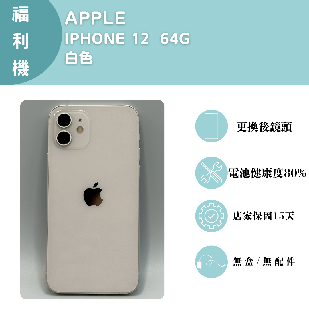 【手機名稱】 APPLE I12 【容量】64G 【顏色】白色 【配件】無盒子/無配件 【電池】電池健康度80% 【換修】更換後鏡頭 下單前請先私訊和加LINE來幫您安排快速審核及回報審核進度 LINE ID:@kjg6280d 大呼小叫辰通訊行 雲林縣虎尾鎮林森路二段200號 電話:05-6339809 在地經營12年店家 GOOGLE 評價5顆星
