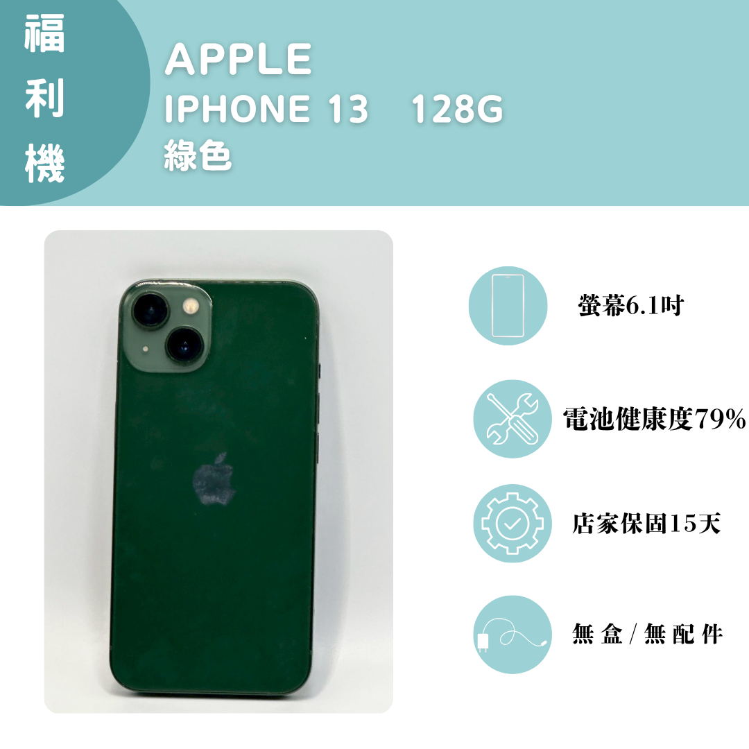 【手機名稱】 APPLE I13 【容量】128G 【顏色】綠色 【配件】無盒子/無配件 【電池】電池健康度79% 下單前請先私訊和加LINE來幫您安排快速審核及回報審核進度 LINE ID:@kjg6280d 大呼小叫辰通訊行 雲林縣虎尾鎮林森路二段200號 電話:05-6339809 在地經營12年店家 GOOGLE 評價5顆星