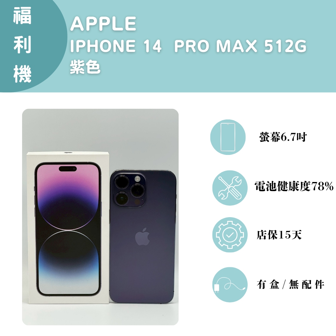 【手機名稱】 Apple I14 PRO MAX 【容量】512G 【顏色】紫色 【配件】有盒子/無配件 【電池】電池健康度78% 下單前請先私訊和加LINE來幫您安排快速審核及回報審核進度 LINE ID:@kjg6280d 大呼小叫辰通訊行 雲林縣虎尾鎮林森路二段200號 電話:05-6339809 在地經營12年店家 GOOGLE 評價5顆星