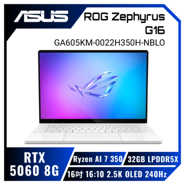 NVIDIA® GeForce RTX™ 5060 8GB GDDR7 (具備MUX獨顯直連) AMD Ryzen™ AI 7 350 Processor 2.0GHz 16-inch / 2.5K (2560 x 1600, WQXGA) 16:10 aspect ratio / 240Hz / OLED