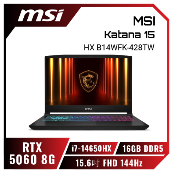 搭載 Intel i7-14650HX 處理器 搭載 NVIDIA® GeForce RTX™ 5060 筆記型電腦GPU 8GB GDDR7 15.6吋 FHD, 144Hz更新率, IPS等級面板,DCI-P3 100% 獨立顯卡模式(MUX獨顯直連設計) ,推升效能至全新境界 獨家Cooler Boost 5 高效散熱設計 獨家微星AI智慧引擎針對使用情境自動切換最佳效能模式 MSI App Player 軟體,用電競筆電暢玩手遊 支援播放高解析音樂 Wi-Fi 6E提供極速無線網路體驗 Windows 11 Home
