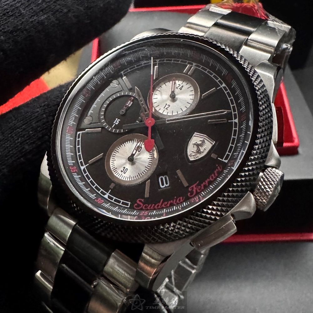 FERRARI手錶,編號FE00098,48mm黑圓形精鋼錶殼,黑色三眼, 中三針顯示, 運動錶面,銀黑相間精鋼錶帶款